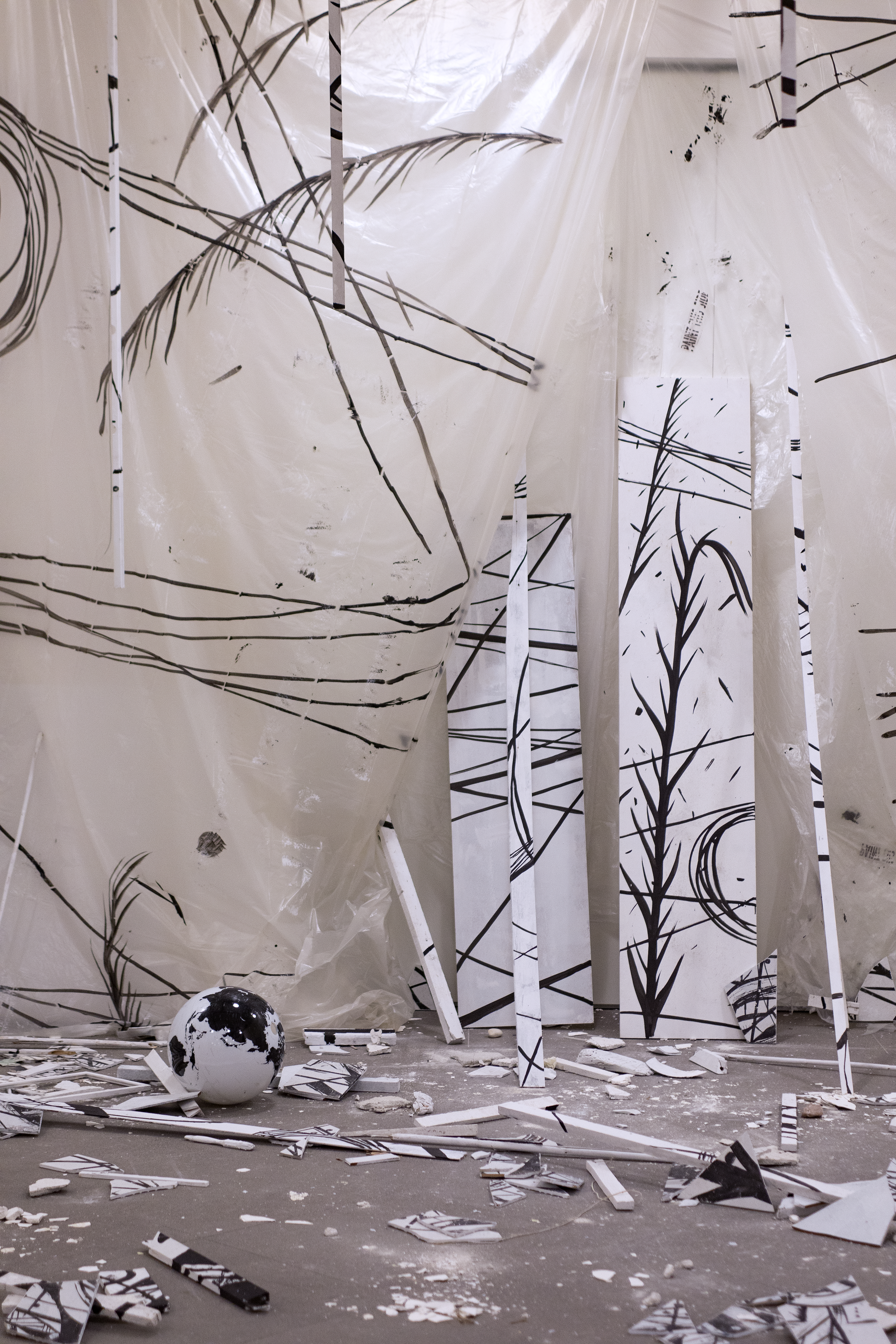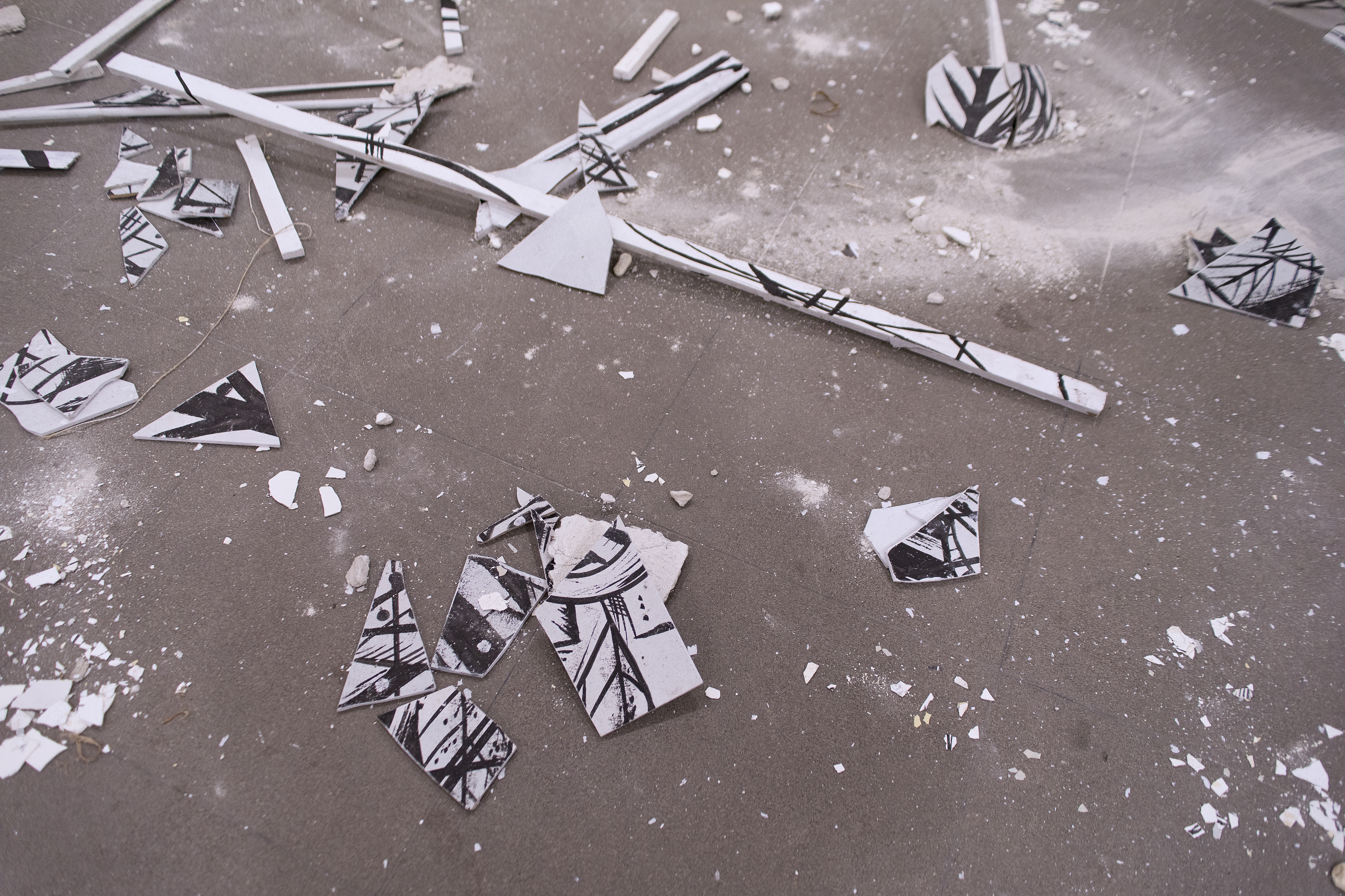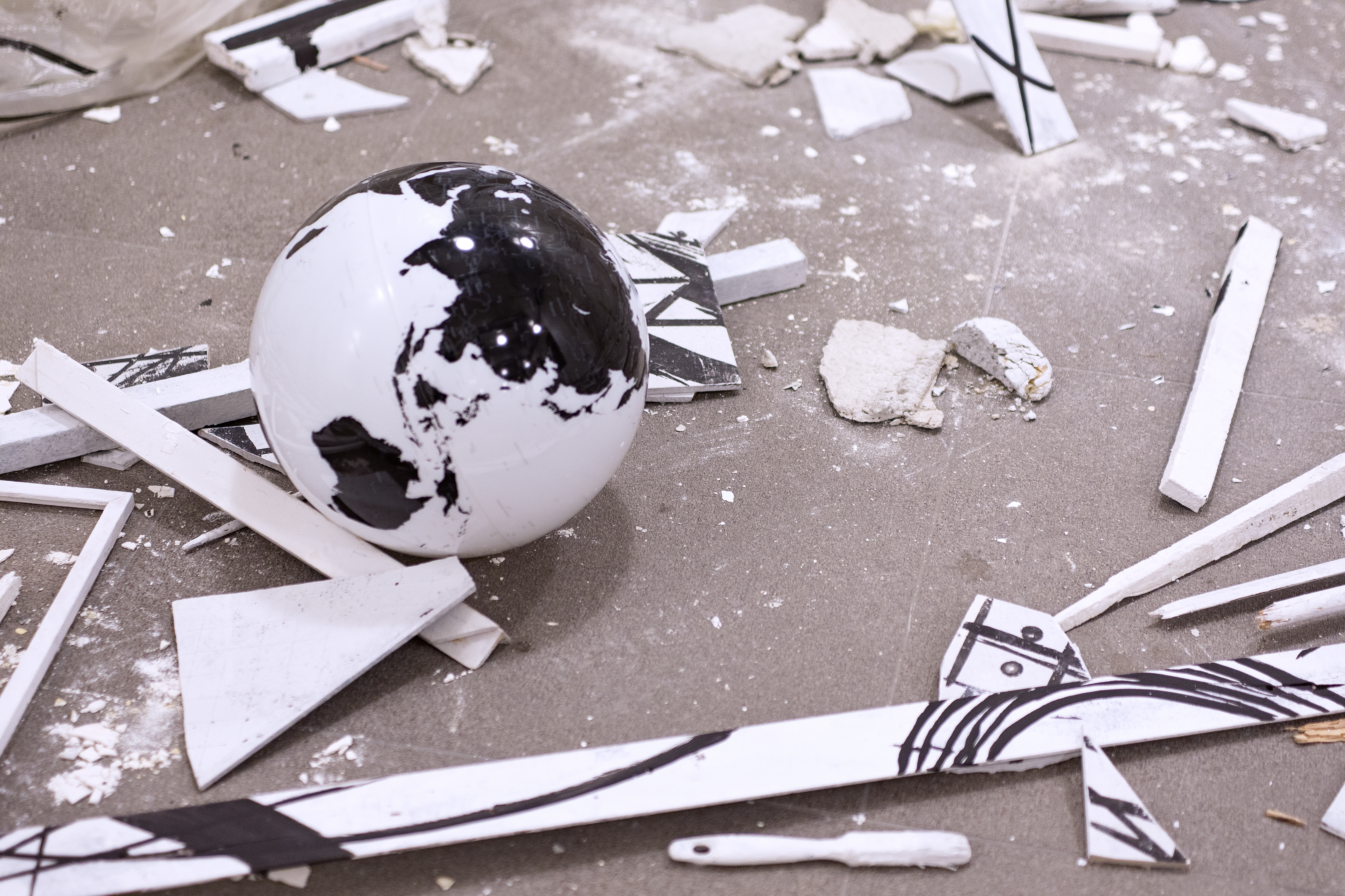 Mondo Fragile è un’installazione pittorica assordante che riflette sul crollo della società e sulla fragilità del nostro tempo. Ho costruito un paesaggio scomposto fatto di macerie e frammenti, dove ogni elemento racconta una storia di decadimento e resistenza. L’ambiente, rigorosamente in bianco e nero, accentua la sensazione di sospensione e silenzio, mentre i detritti sul suolo delineano un orizzonte effimero. Tra le rovine, emerge un mappamondo che rotola come un pallone, quasi casualmente. La sua presenza nel caos simboleggia la fragilità del nostro pianeta, abbandonato ai margini tra i resti di una società in declino.