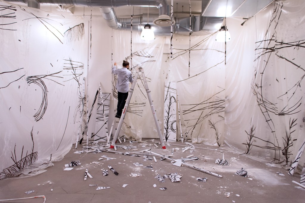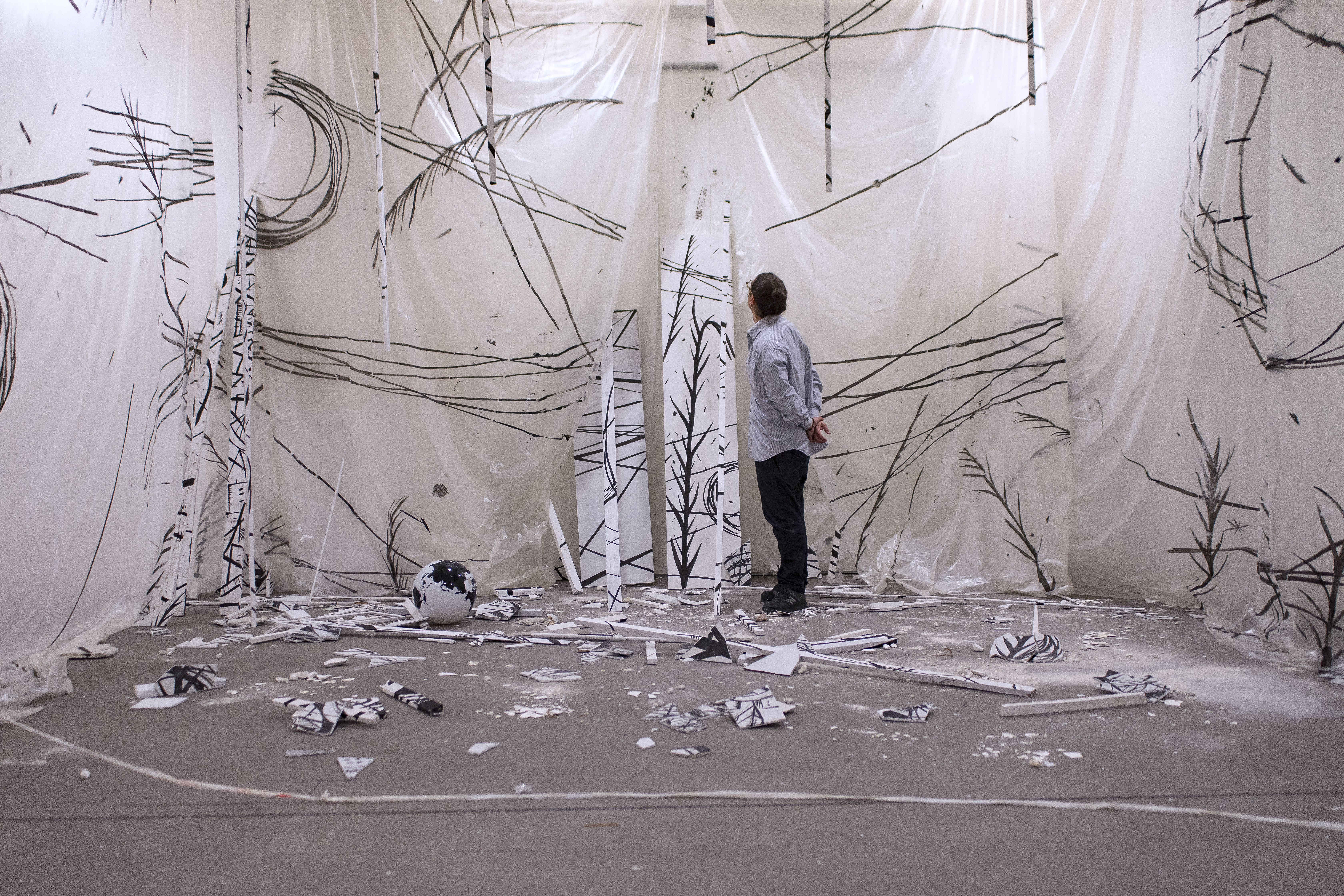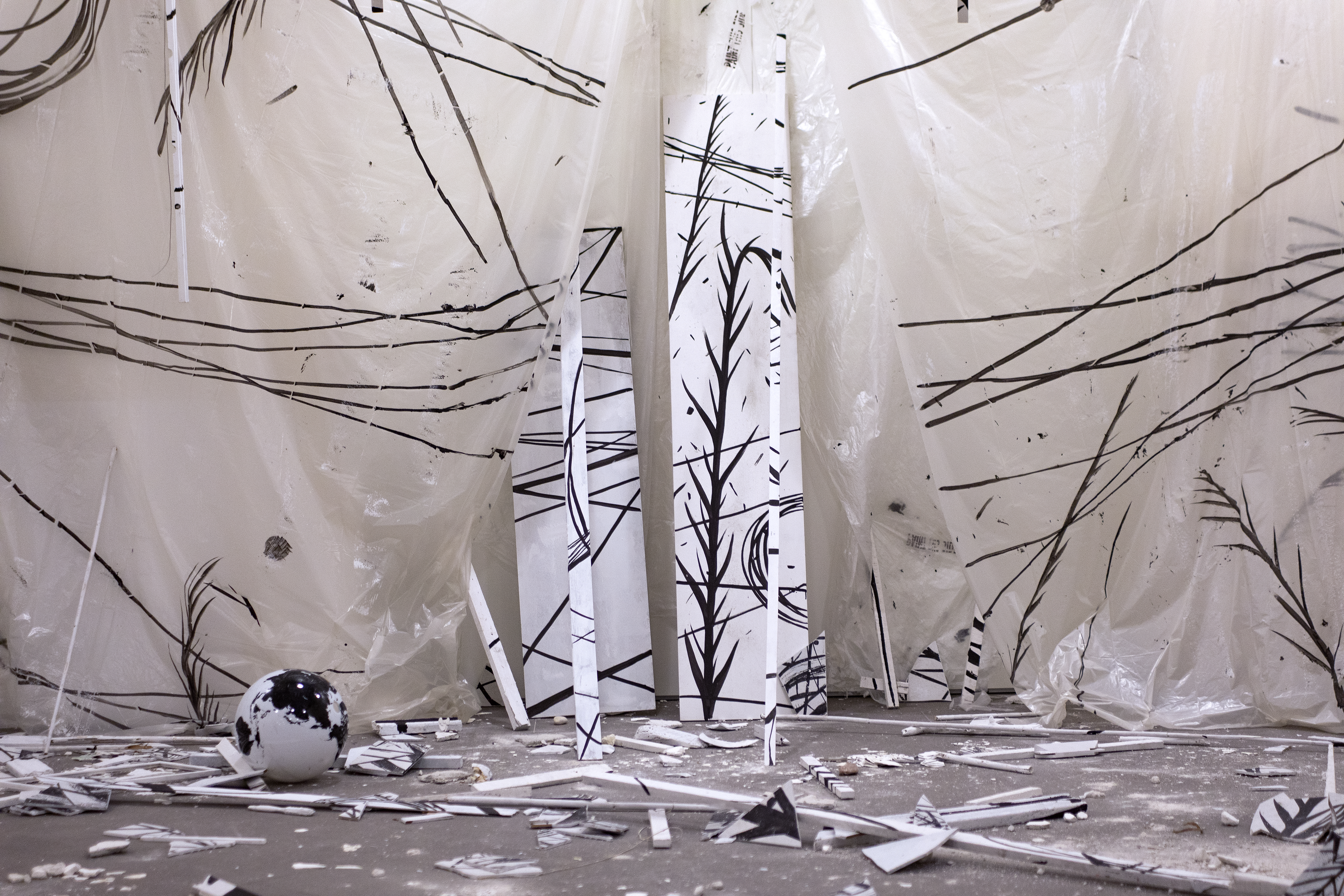 Mondo Fragile è un’installazione pittorica assordante che riflette sul crollo della società e sulla fragilità del nostro tempo. Ho costruito un paesaggio scomposto fatto di macerie e frammenti, dove ogni elemento racconta una storia di decadimento e resistenza. L’ambiente, rigorosamente in bianco e nero, accentua la sensazione di sospensione e silenzio, mentre i detritti sul suolo delineano un orizzonte effimero. Tra le rovine, emerge un mappamondo che rotola come un pallone, quasi casualmente. La sua presenza nel caos simboleggia la fragilità del nostro pianeta, abbandonato ai margini tra i resti di una società in declino.