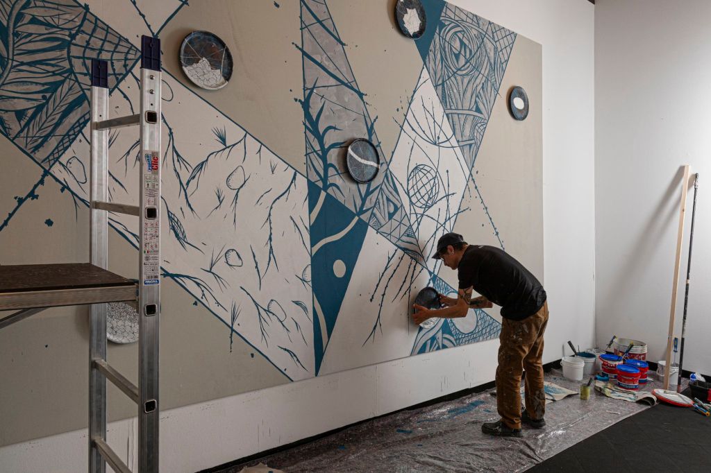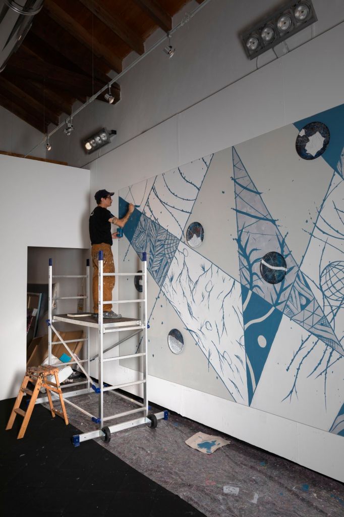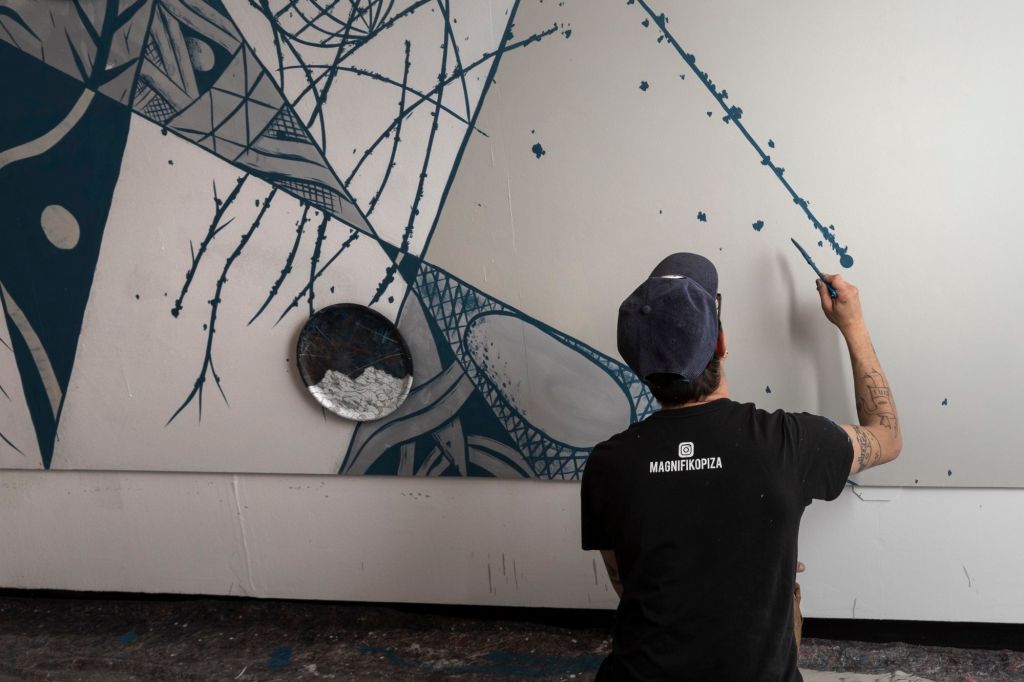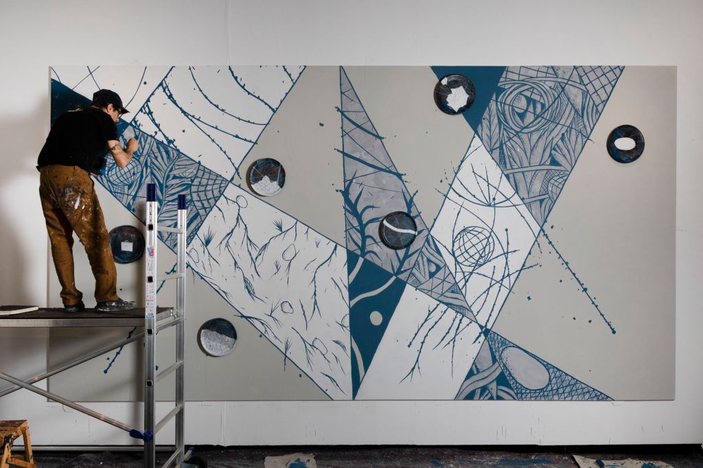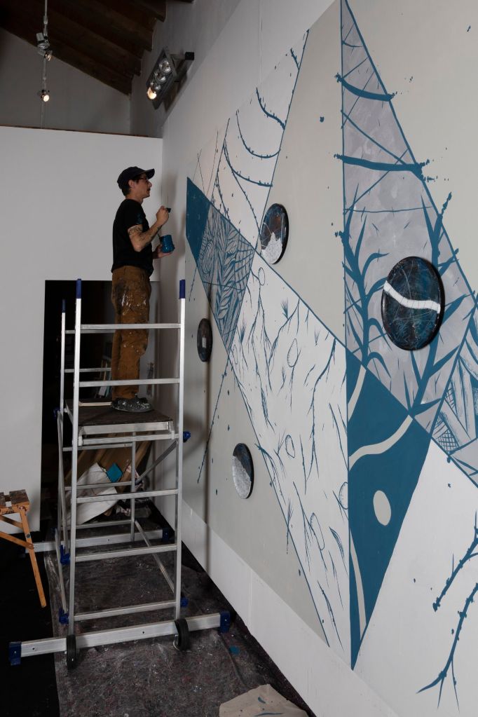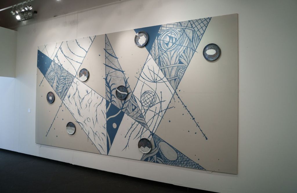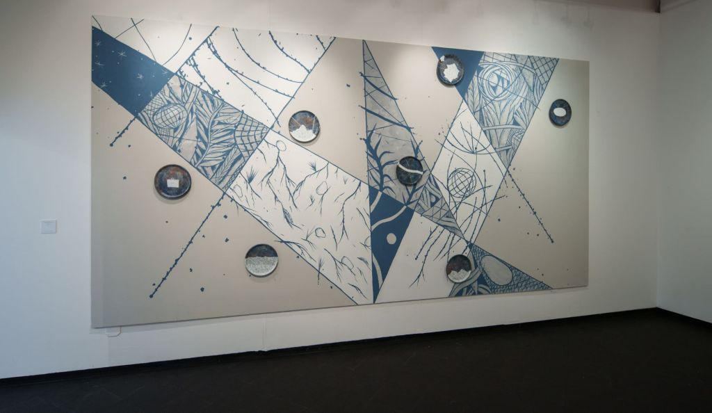 Questa installazione si propone come un invito ad andare oltre: “Una geografia immaginaria composta da sezioni o frammenti di mondo che raccontano un territorio, il suo paesaggio, le sue trasformazioni urbanistiche e il fenomeno dello spopolamento. La chiave di lettura dell’opera permette al luogo di specchiarsi in questa visione. Si tratta di un grande dipinto realizzato su delle grandi tavole di legno a cui vengono sovrapposti degli inserti scultorei in ceramica, piatti, realizzati con materiali di scarto della nostra società , dipinti e incisi, veri e propri focus sulla memoria dell’umanità.