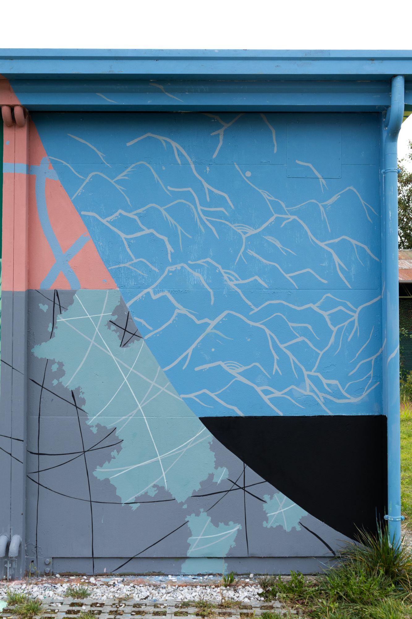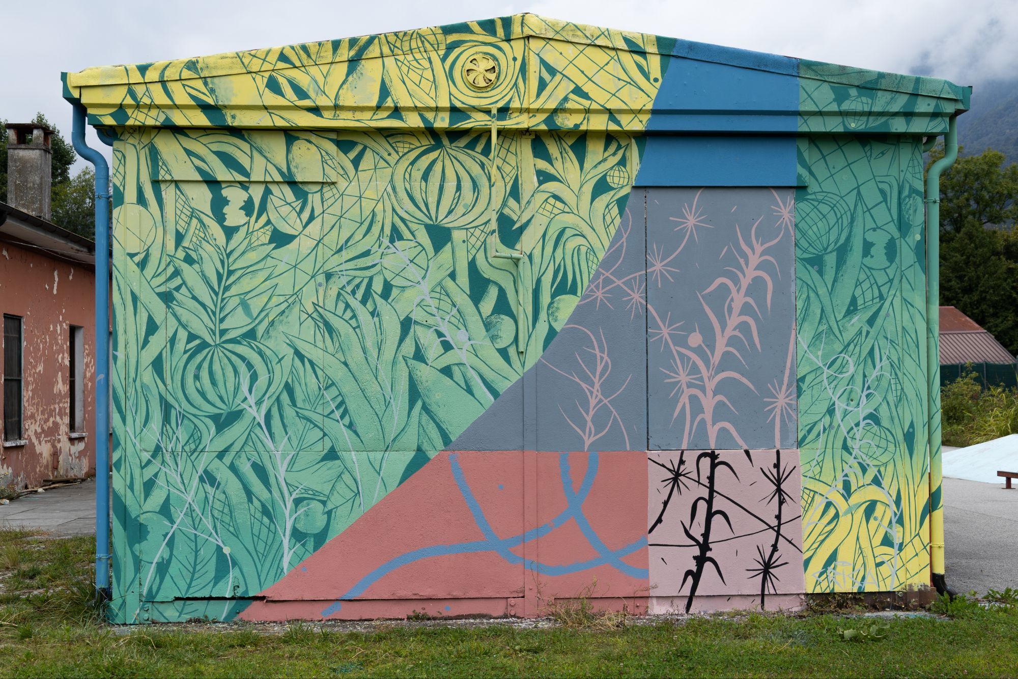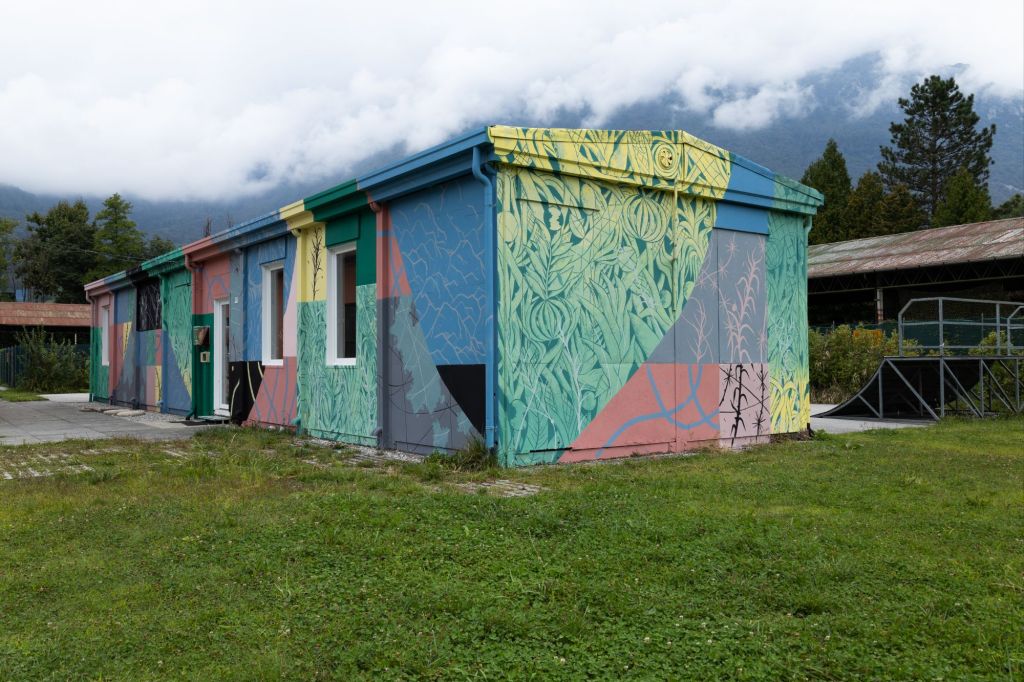 L’intervento si sviluppa come una tessitura visiva che cerca una connessione con le montagne e il Paesaggio delle dolomiti , evocandone ritmi, stratificazioni e andamenti naturali. Le forme dialogano con l’architettura del luogo e con le rampe da skate presenti sul retro dell’edificio, assumendone curve, tensioni e dinamiche di movimento.